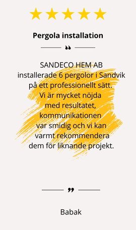 Genom vår erfarenhet av Pergolux produkter säkerställer vi att er nya uteplats installeras med garanti. Vårt team tar hand om hela projektet – från leverans till färdig montering – så att du kan njuta av din nya pergola utan stress.